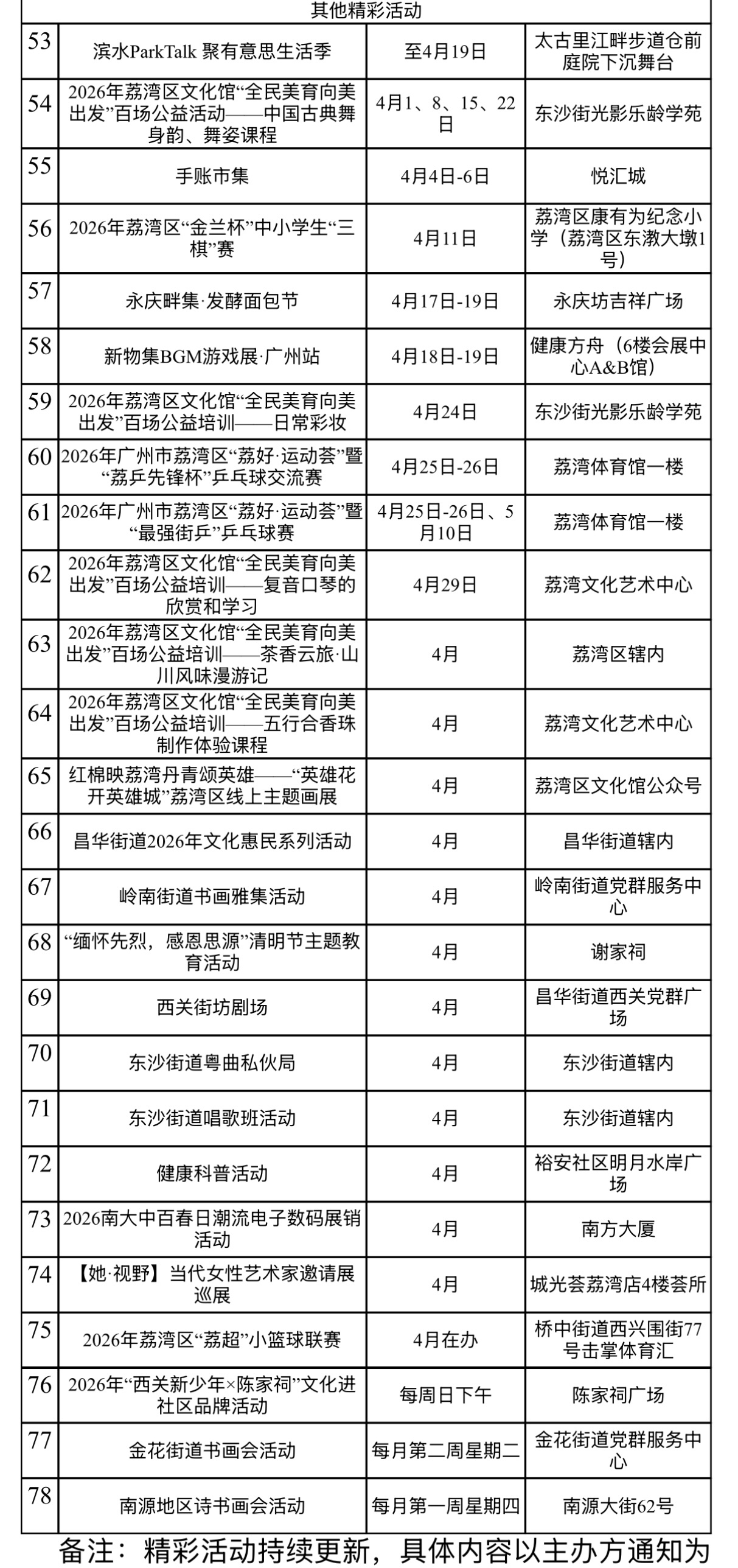 最是书香能致远。荔湾将在四月开展全民阅读系列活动,举办启动仪式并在全区铺开多元体验:名家诗词品鉴、青少年童声共诵、行走课堂、粤语方言伴读……阅读推广的触角将延伸至社区,让文字活跃于西关街巷。与此同时,各街道依托新时代文明实践阵地,围绕不同人群需求推出沙龙、分享、手作等阅读惠民活动,将书香送到家门口,营造“爱读书、读好书、善读书”的浓厚氛围。