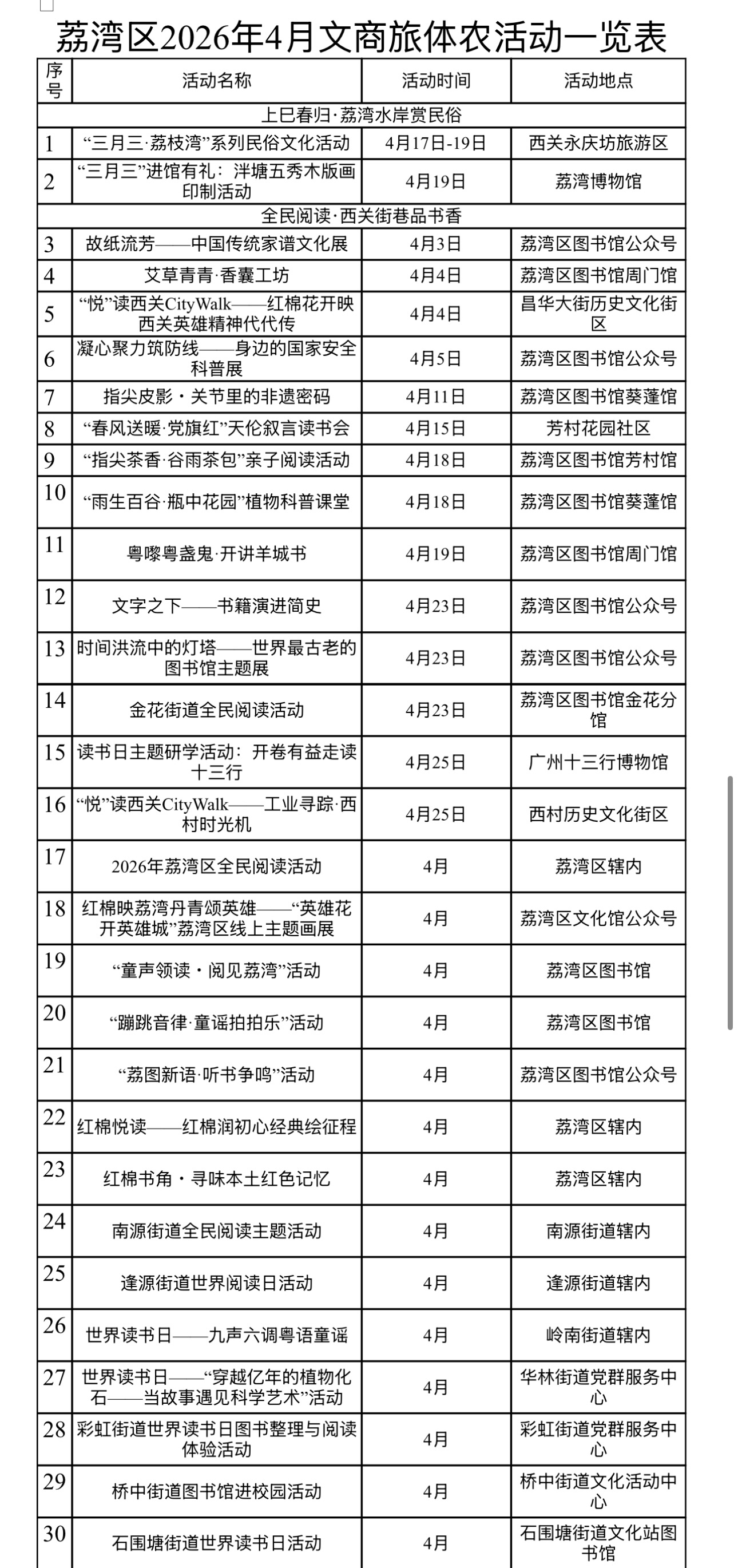 春盛四月,绿意漫过千年西关街巷,荔湾以“民俗·阅读·人文”为脉络,推出“上巳春归”“全民阅读”“文博雅集”三大系列活动。荔枝湾畔的岭南烟火、书香飘溢的阅读盛事、跨越时空的文博之旅,在荔湾交织,诚邀广大市民游客共赴这场文化盛宴!